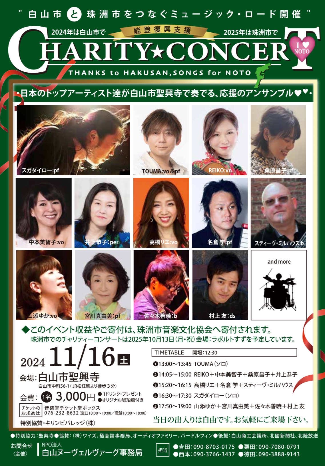 能登復興支援チャリティーコンサート(11/16 土) 11/16(土)白山市の聖興寺にて 8月の台風で延期になったチャリティーコンサートが開催されます✨✨ 素晴らしいミュージシャンたちが全国から集います。 わたしも参加させていただきます。 コンサートは13:00から始まります。 わたしたちの出演は14:05からです。 どうぞご予定くださいね!