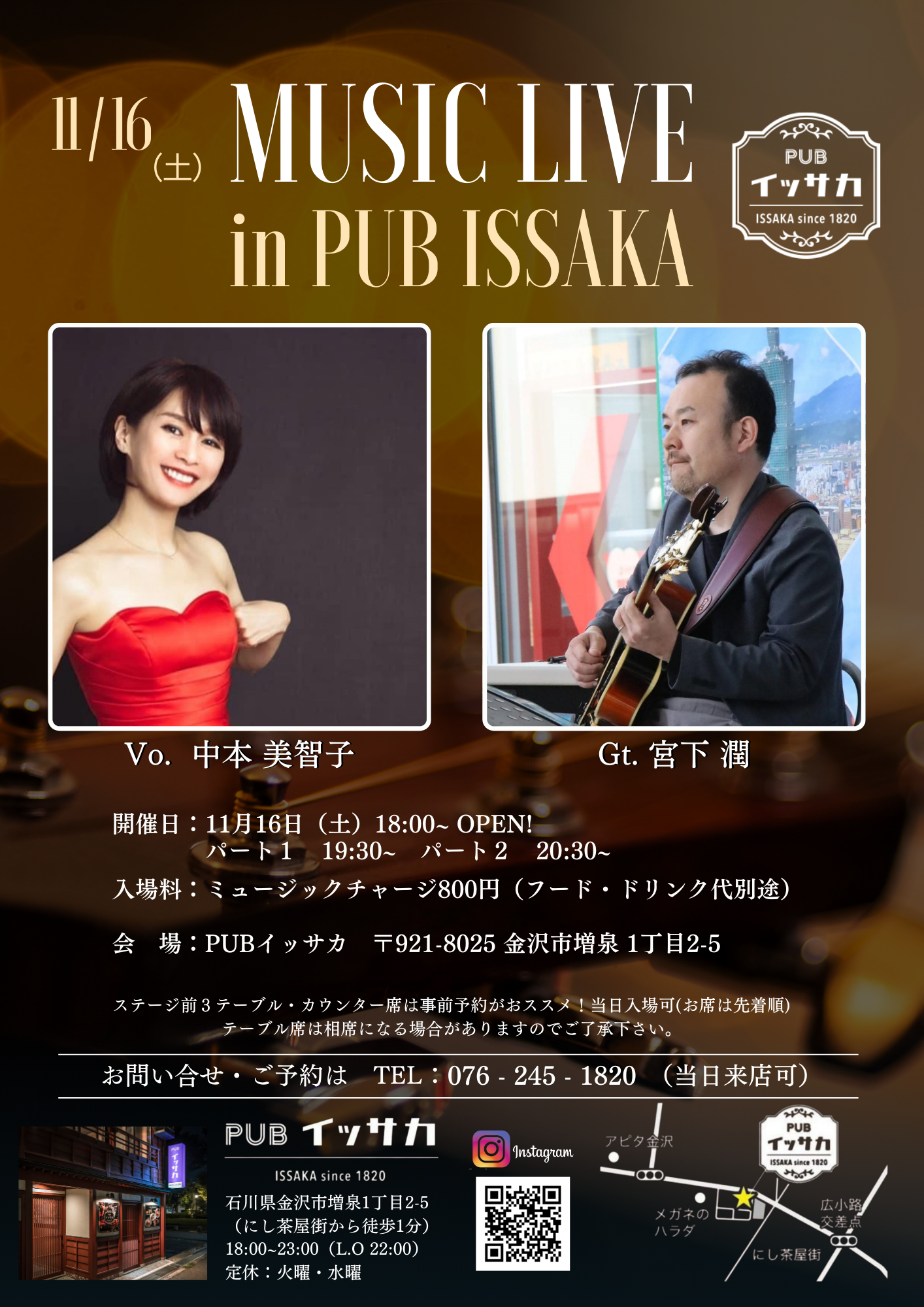 西茶屋『イッサカ』出演します(11/16) 西茶屋のミュージックバー『イッサカ』。 皆さん、もう行かれましたか? 金沢の繁華街片町から歩いて5分、ぐっと落ち着いた雰囲気でくつろげる穴場スポットです✨ 音響がとってもいいので、ギターの温かい響きがとても気持ちよいです。 11/16 19:30からは宮下潤さん(ギター)とデュオで演奏します。 2ステージ、入替制ではないのでゆっくりとおくつろぎくださいね! お待ちしています😊✨