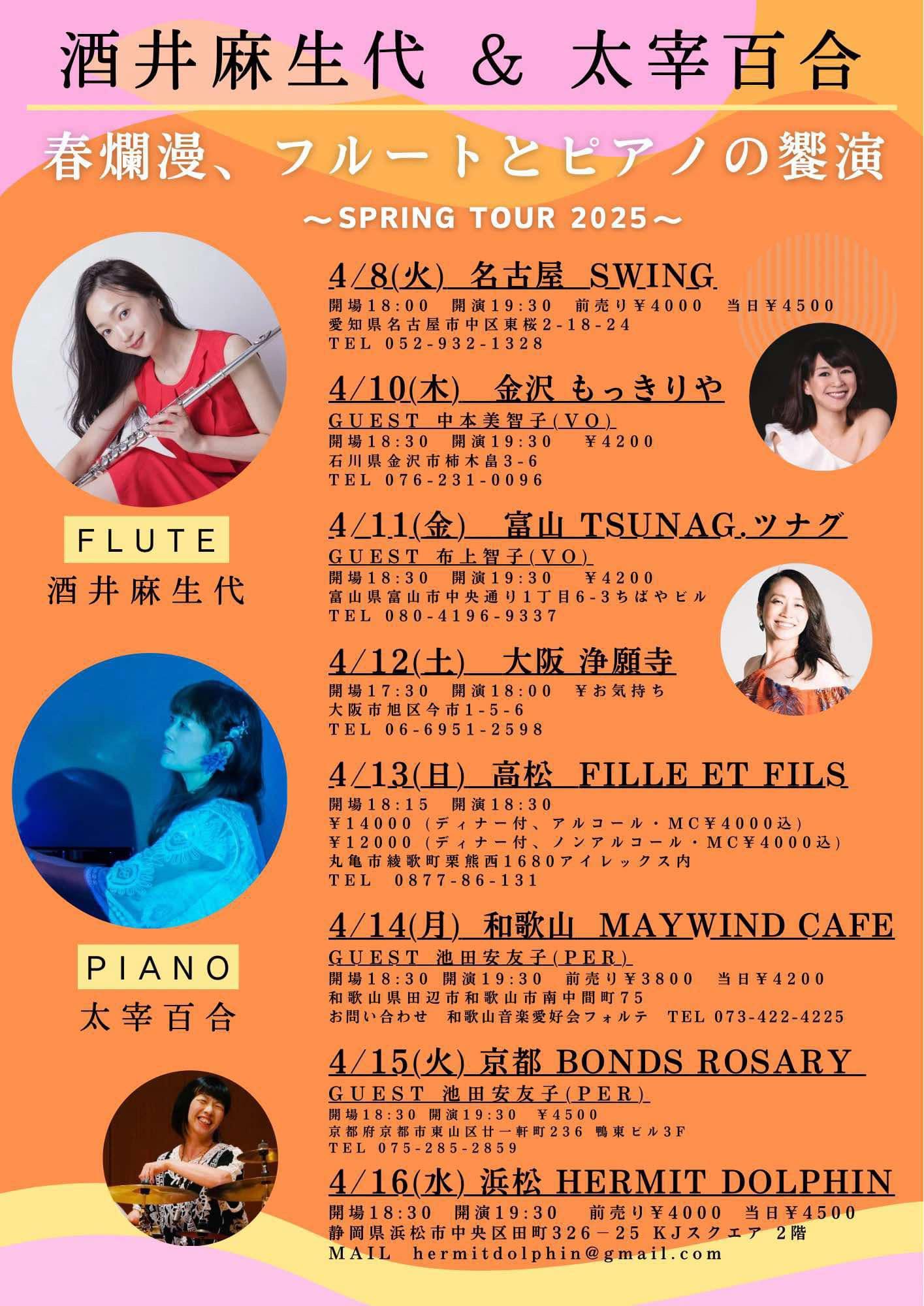 酒井麻生代さんが北陸にやってきます✨ 少し先になりますが、、 4月は素晴らしいフルーティスト 酒井麻生代さんが北陸にやってきます✨✨ 酒井麻生代&太宰百合 『春爛漫、フルートとピアノの饗演 Spring tour2025』 4月8日から16日までのこちらのツアーですが 金沢(もっきりや)は 4月10日(木) 19:30スタートです✨✨✨ 聡明でひたむきな麻生代さんの素晴らしい世界にぜひ触れて、浸っていただきたいです。 わたしもゲストで参加させていただきます。 楽しみだ、、、💗 ぜひぜひ予定くださいね!