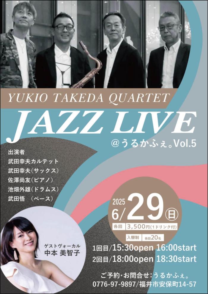 6月29日は福井県のうるかふぇ。にまいります^^ 6月29日はゴキゲンなカルテットとご一緒させていただきます! 演奏も最高ですし、なんせおしゃべりが面白すぎるんです。 なんでしょうか、包容力なのか、センスなのか。。。。 武田幸夫カルテット、いつもたくさんのファンの方々で盛り上がっていますが その気持ち、わかります! 今回初めてうるかふぇ。に出演させていただきます。 楽しみです。 ぜひ聴きにいらしてくださいね!